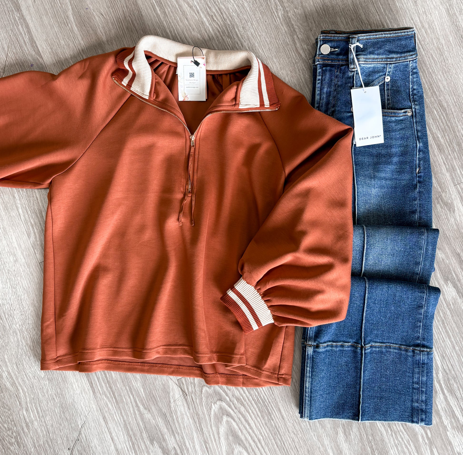 Introducing the Archie Top, a stylish and versatile clay-colored top that will elevate any outfit. This pullover style top features light tan stripes on the wrist and collar, adding a touch of sophistication. Perfect for any occasion, the Archie Top is a must-have for your wardrobe!