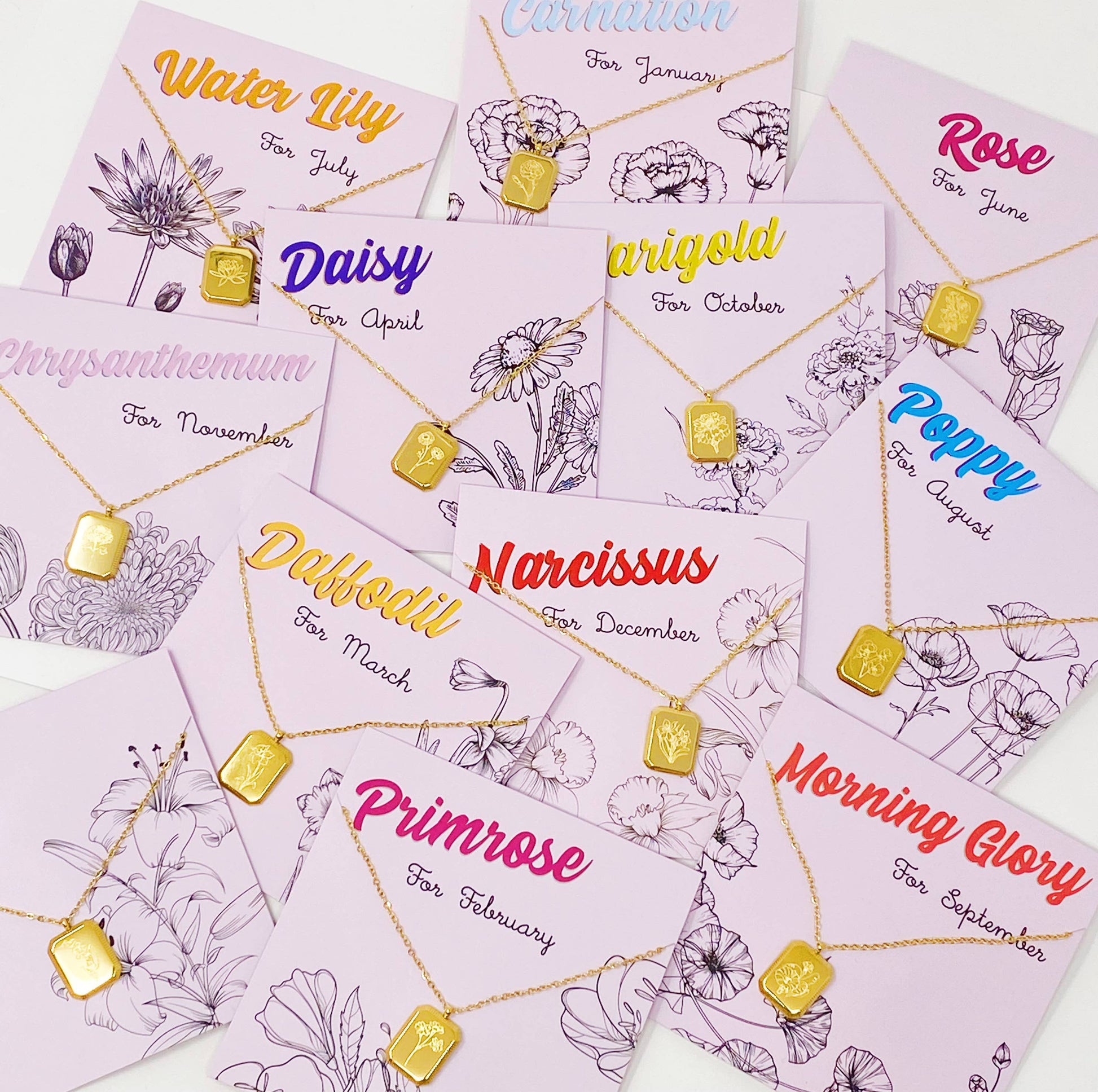 The pendant of this necklace is delicately engraved special flower for each month. Classy square shape with detailed edge finish. Absolutely gorgeous flowers for all 12 months and high polished!