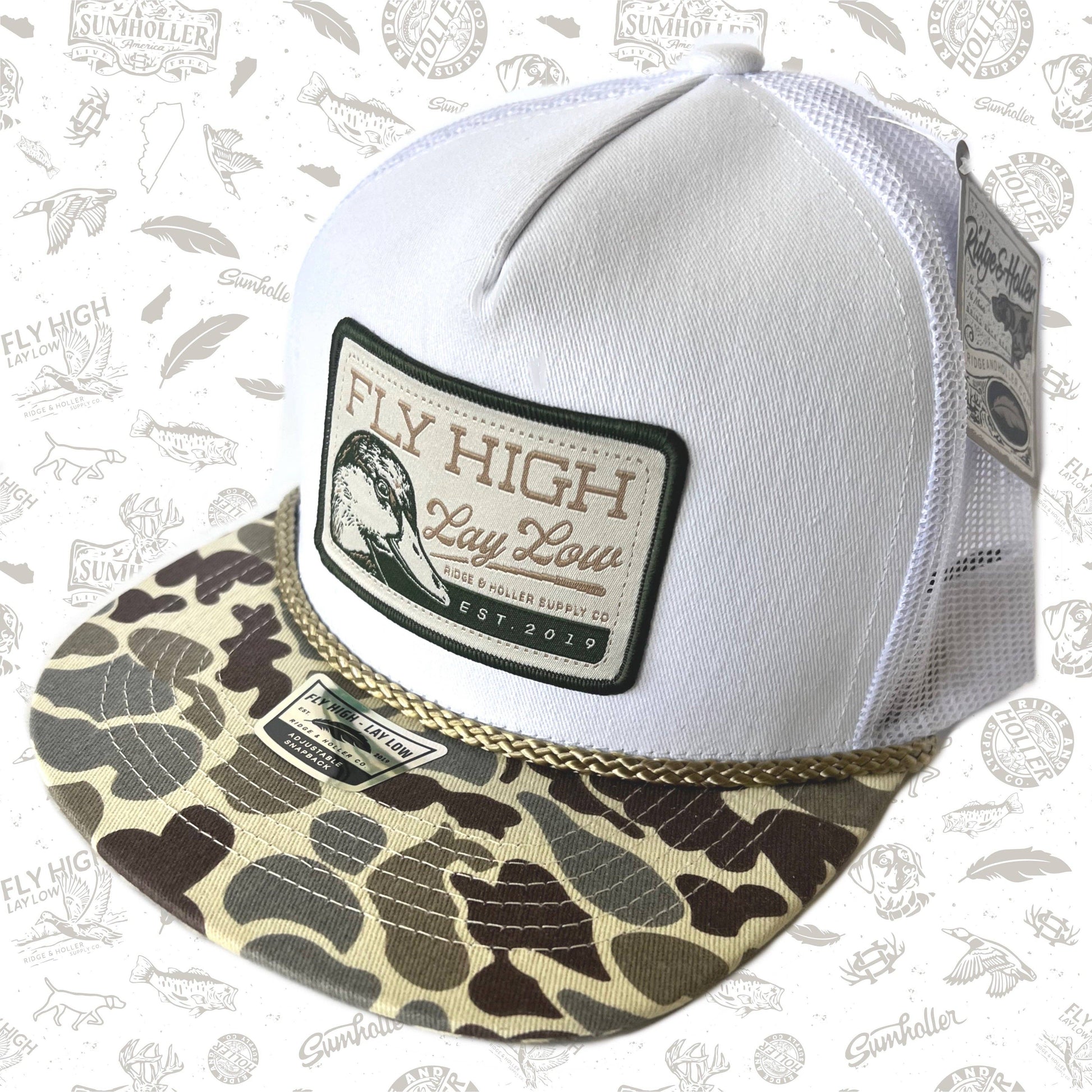 Introducing the latest addition to the Ridge&Holler collection - the Bottoms Creek hat. This is a limited edition style. It combines style and comfort with a flat bill and tall crown fit, featuring a clean white and camo color way that adds a touch of rugged appeal. Stay comfortable on your next outdoor excursion with this versatile cap.