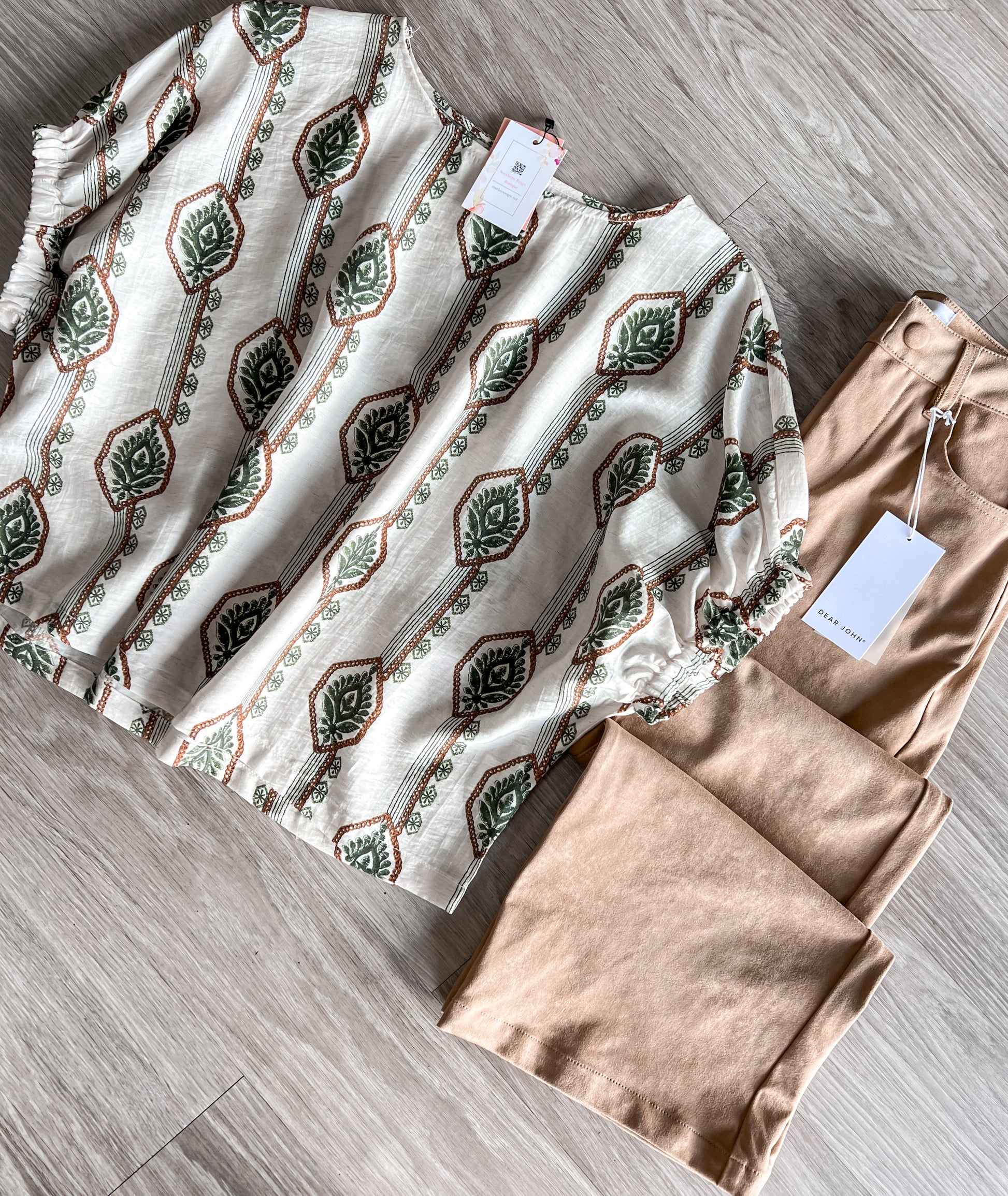Meet your new favorite top – the Brynlee! With a fun geometric and floral print, this top adds a playful touch to any outfit. Plus, the elastic cuff sleeves make it comfortable and versatile for all-day wear. Perfect for adding a bit of quirk to your wardrobe.