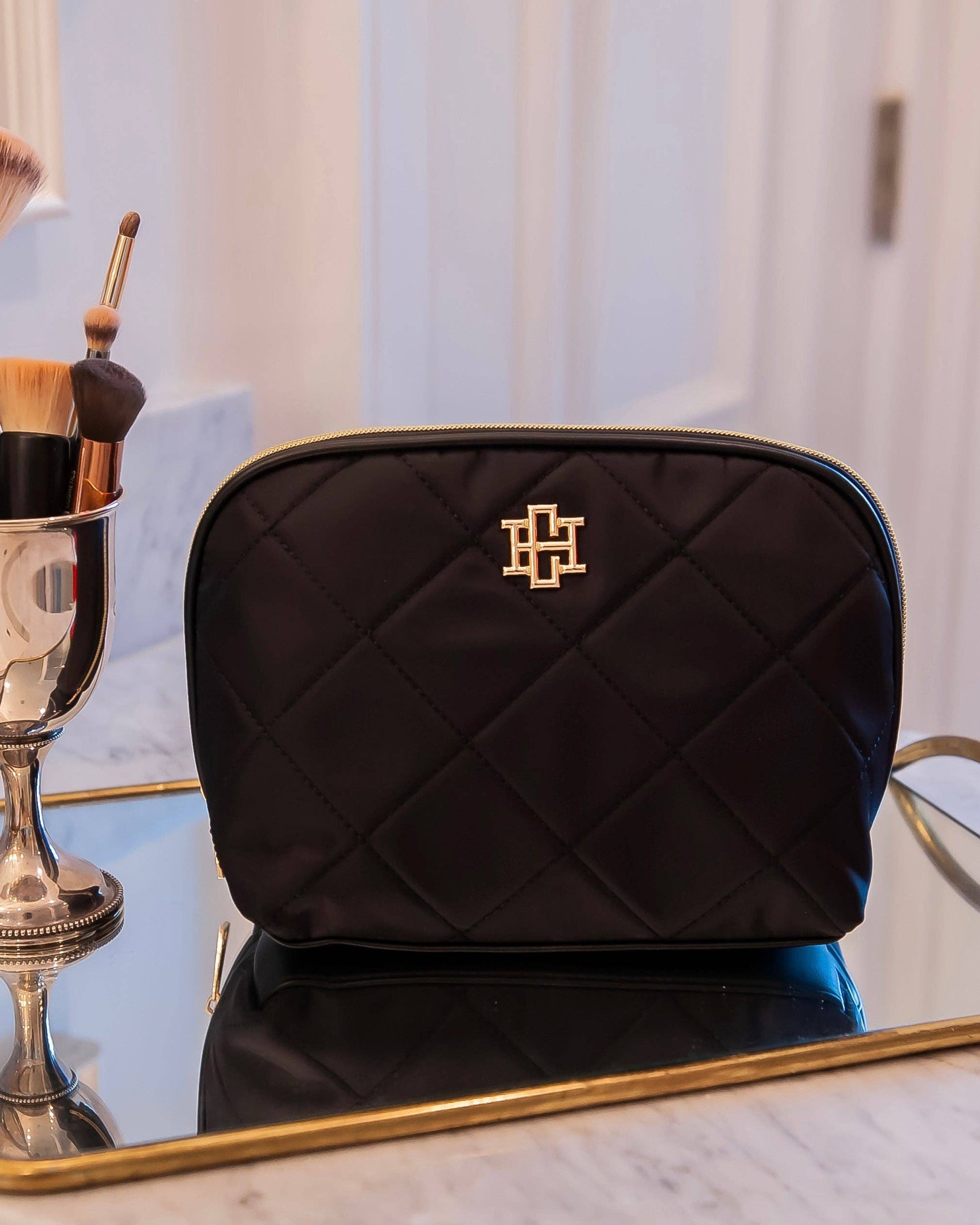 This beautiful quilted nylon pouch is part of our makeup and travel collection and features a stylish quilted fabric design. The elongated zipper provides easy access, making it perfect for organizing makeup, toiletries, and hair accessories. The spacious interior is lined with hot pink with a clear protective fabric that is easily wipeable. It also has mesh pockets to keep cosmetics neatly stored and accessible.