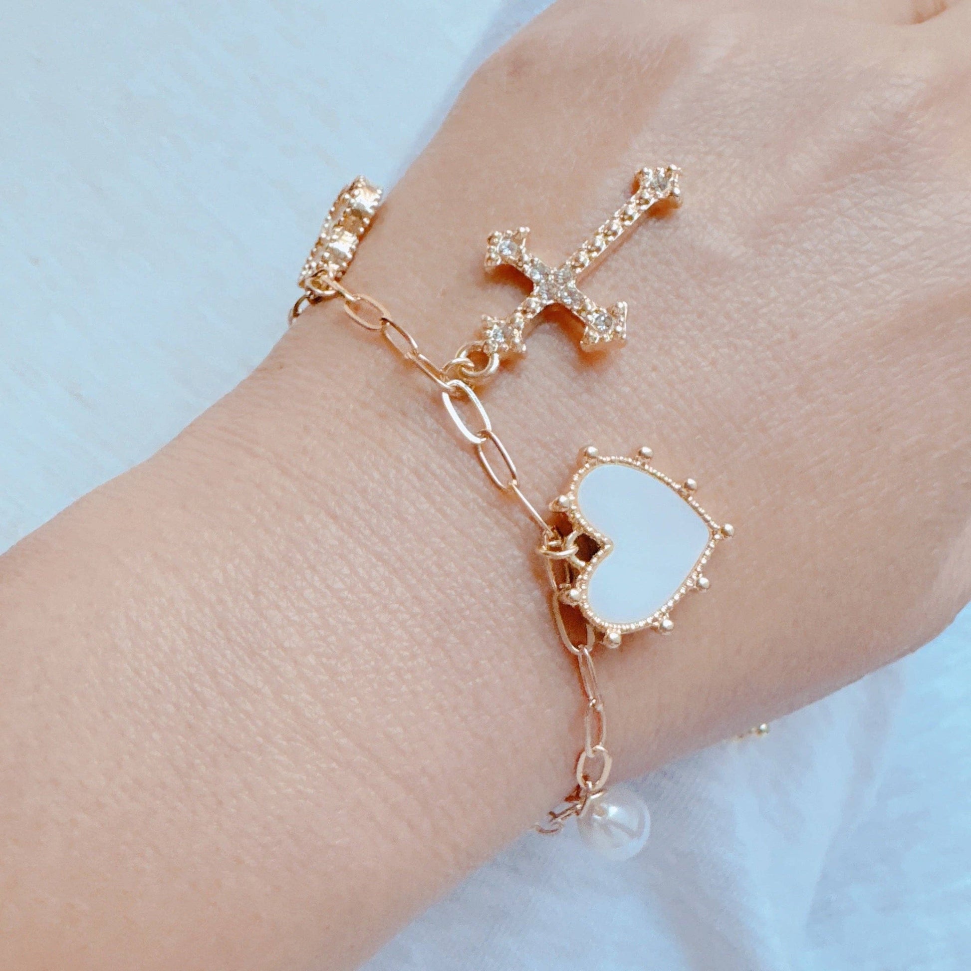 Introducing our Cross Clover Multi Charm Bracelet, featuring a modern and unique design that combines crosses and clovers for a charming touch. Dimensions: approximately 7" w/ a 2” extender Plated metal Lead and Nickel compliant