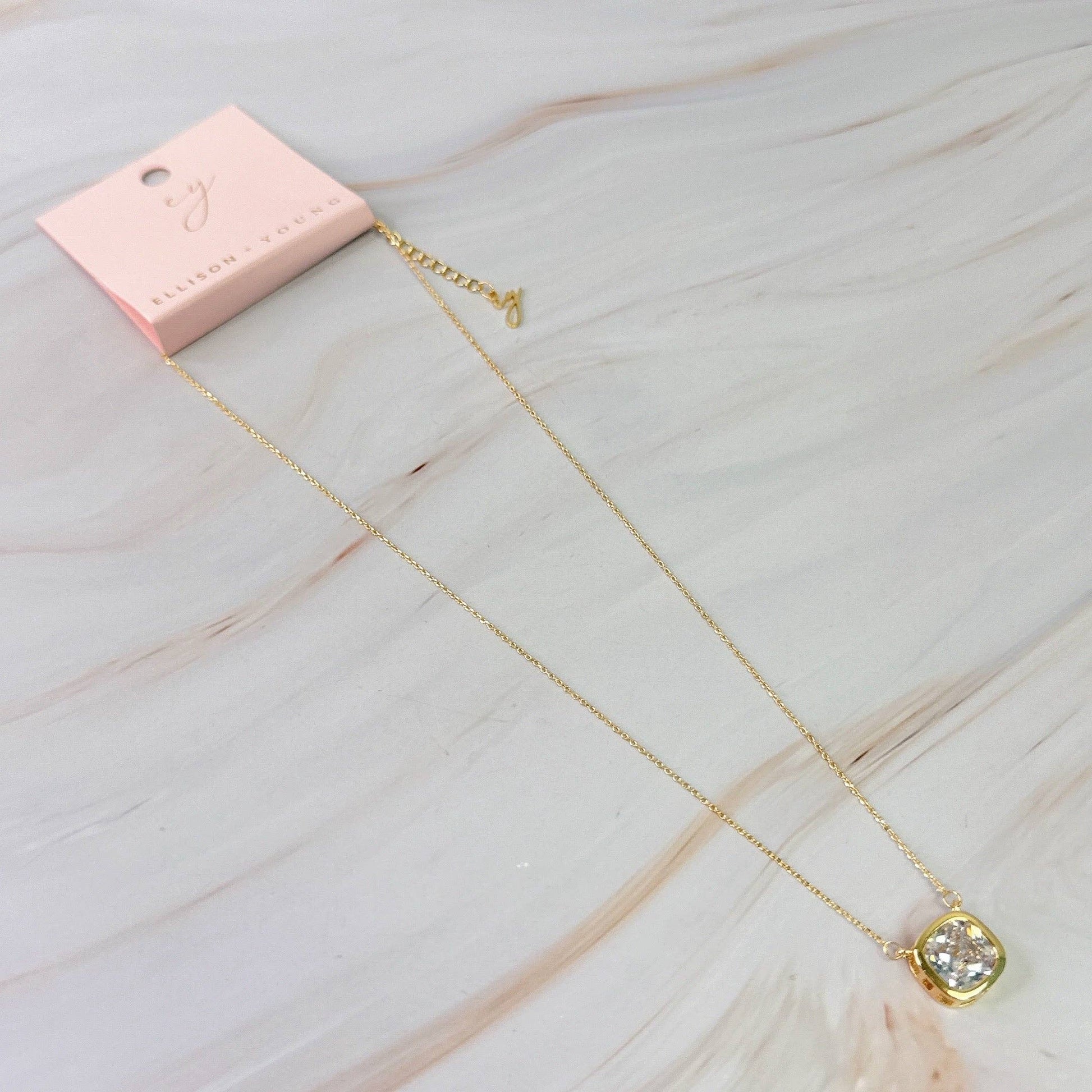 Enhance your style with this exquisite cushion cut diamond necklace. Its elegant design and sparkling shine make it a must-have accessory for any outfit. Add it to your jewelry collection for a touch of sophistication. Dimensions: Approximately 16" w/ 2" extender 18k gold plated brass Lead and nickel free