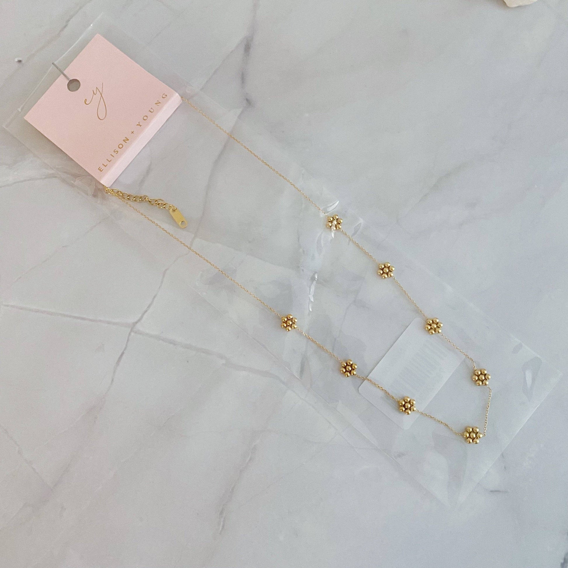 This Dainty Golden Bead Flower Necklace features tiny ball bead flowers with a dainty chain, creating an elegant and eye-catching look. Perfect for any occasion, this necklace is easy to dress up or down. It's beautiful to wear it alone or a great layering piece to complete your outfit. Approximately 16" with a 2" extender 18k gold plated stainless steel Lead and Nickel free Ethically sourced