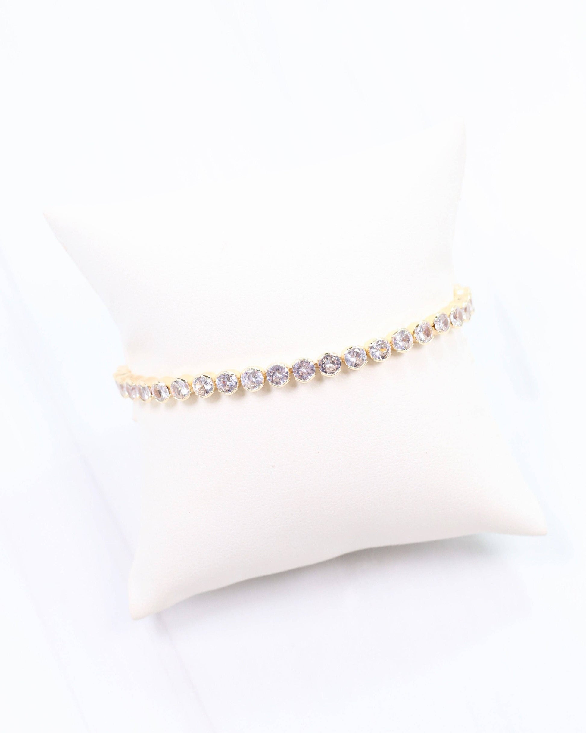 Add a sparkle to your wrist with the Denise CZ Bracelet in gleaming gold. Featuring a string of round CZ stones in a classic tennis bracelet style, it’s perfect for adding a touch of fun and shine to any outfit. Great piece for layering or wearing alone.