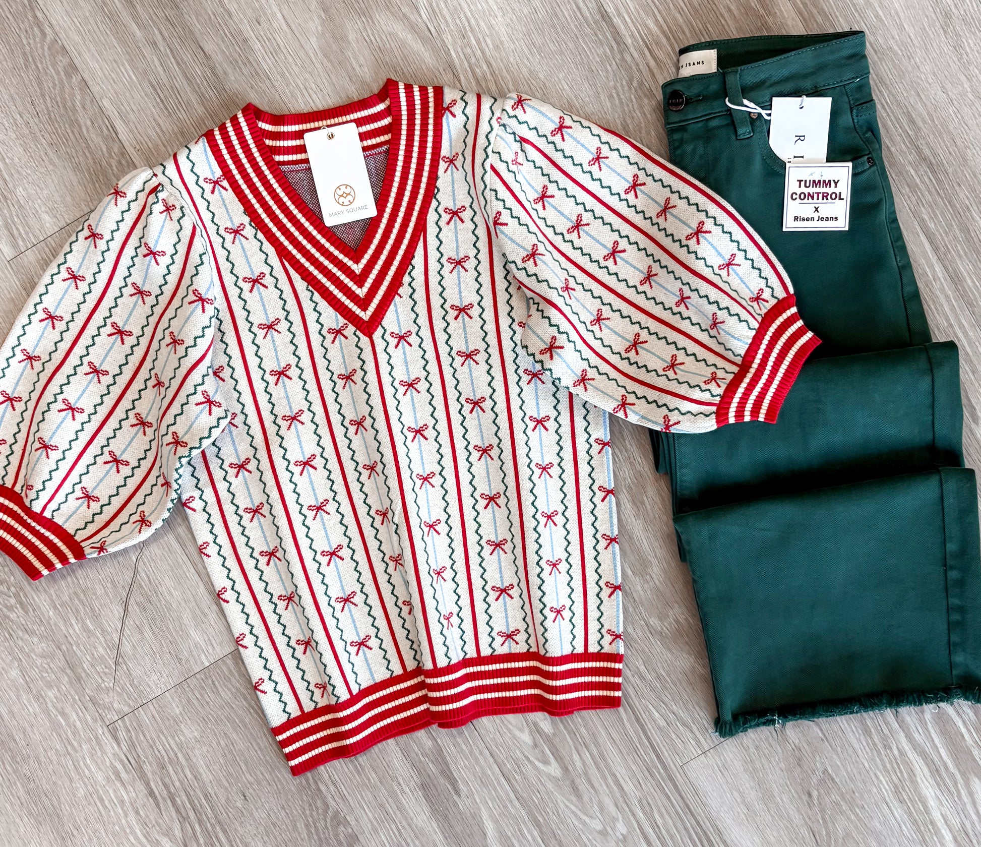 Get into the holiday spirit with the Faith Sweater Top! This festive sweater features a flattering v-neck and eye-catching red and white striped trim detail. Stay warm and stylish while spreading cheer.
