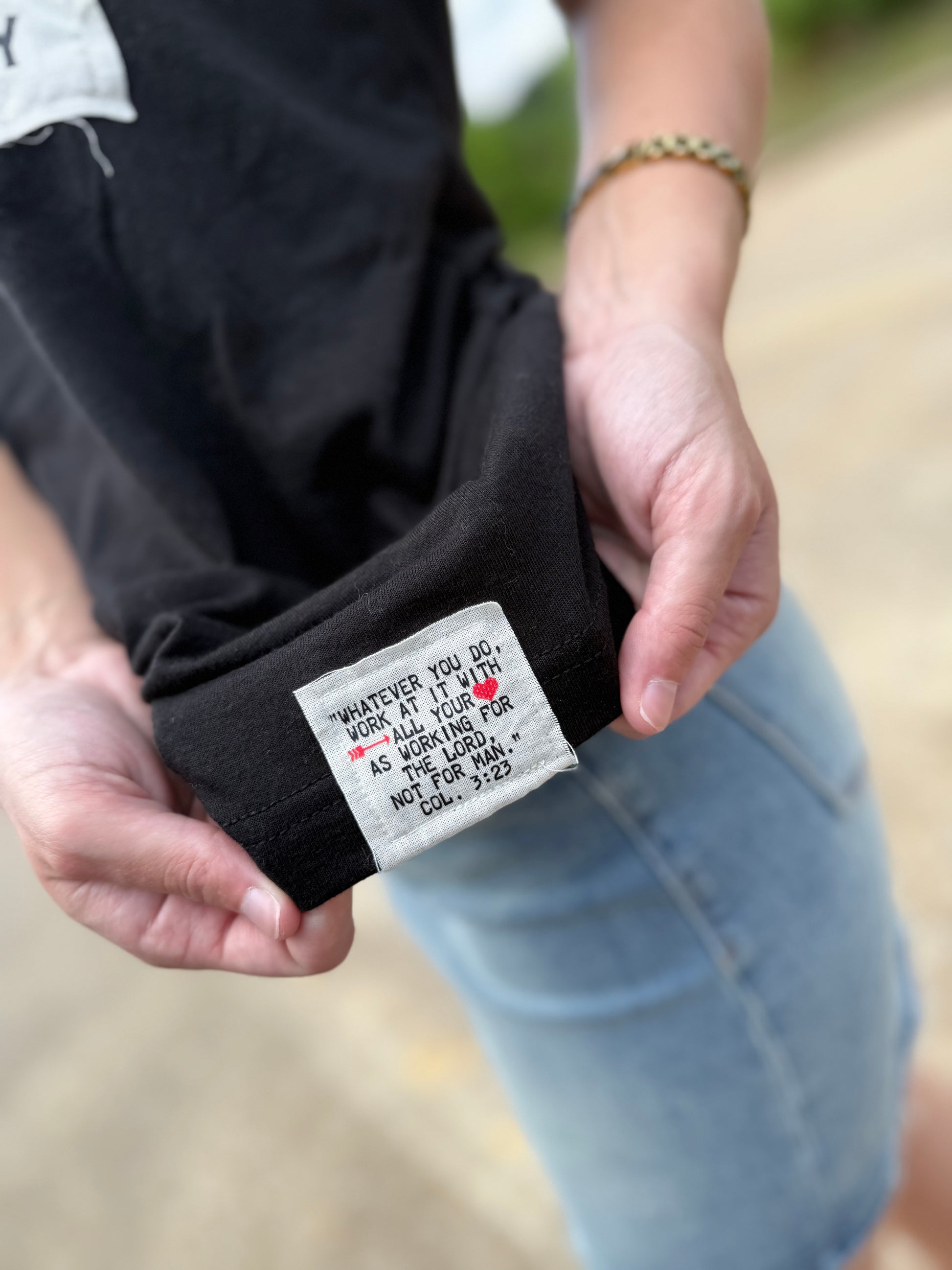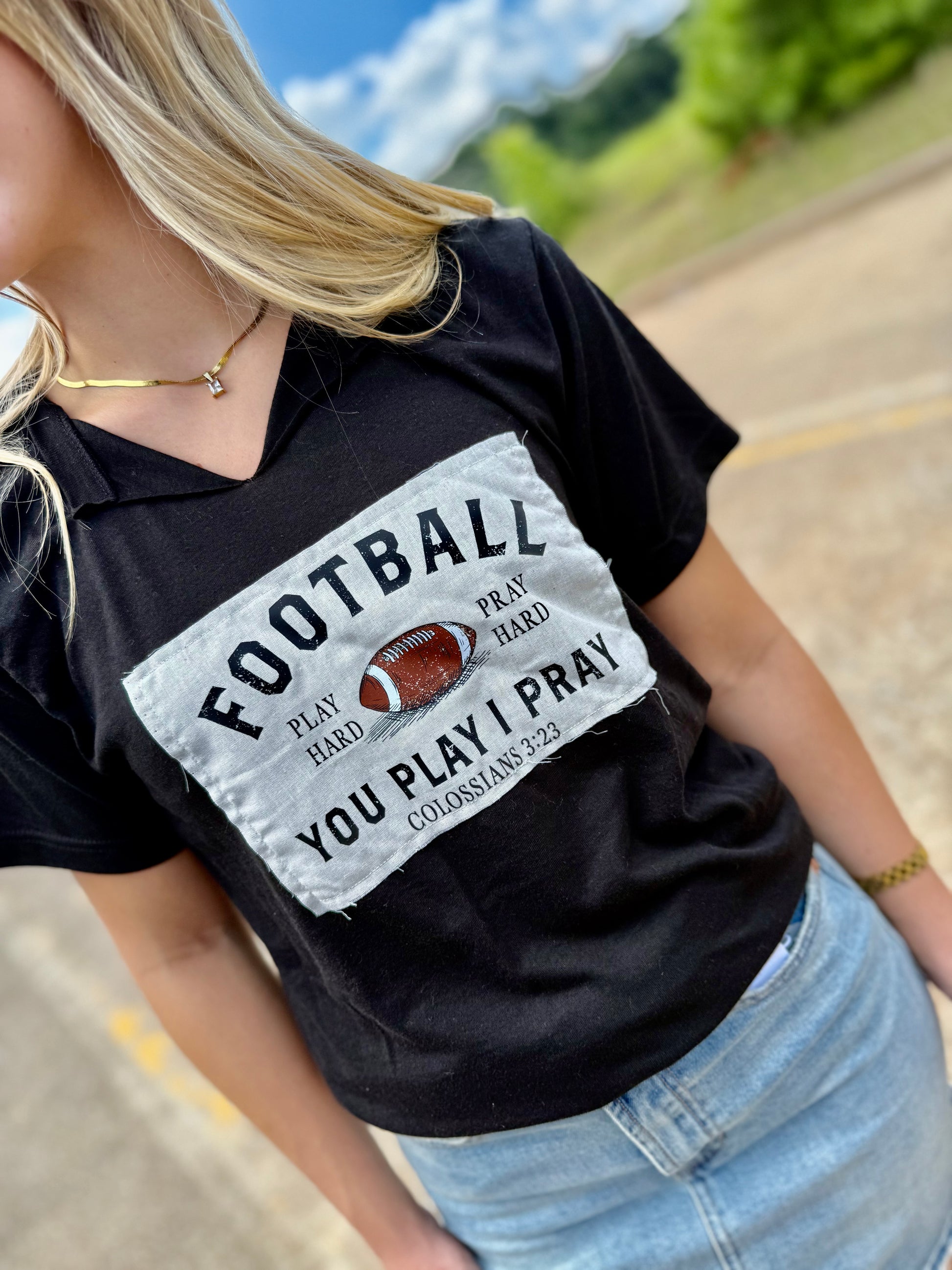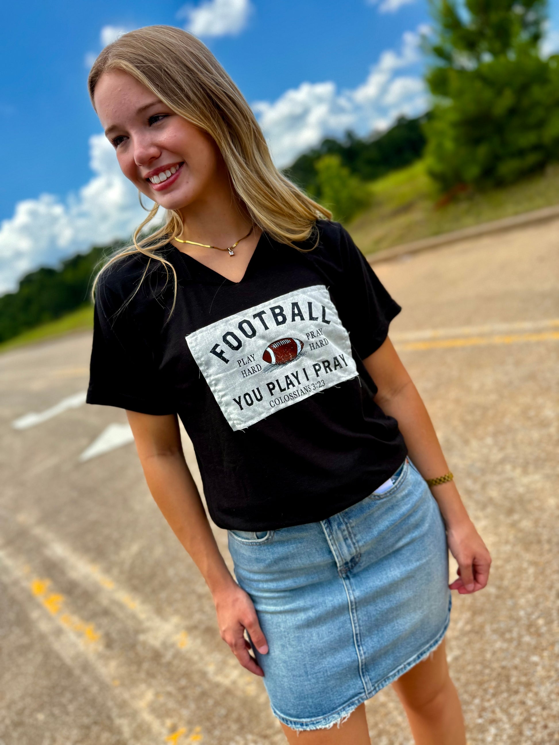 Our popular hand-made patch v-neck is a fan favorite! Your sports moms are sure to stand out in these unique tops! They are an oversized soft tee that makes them cool for all those hot games!