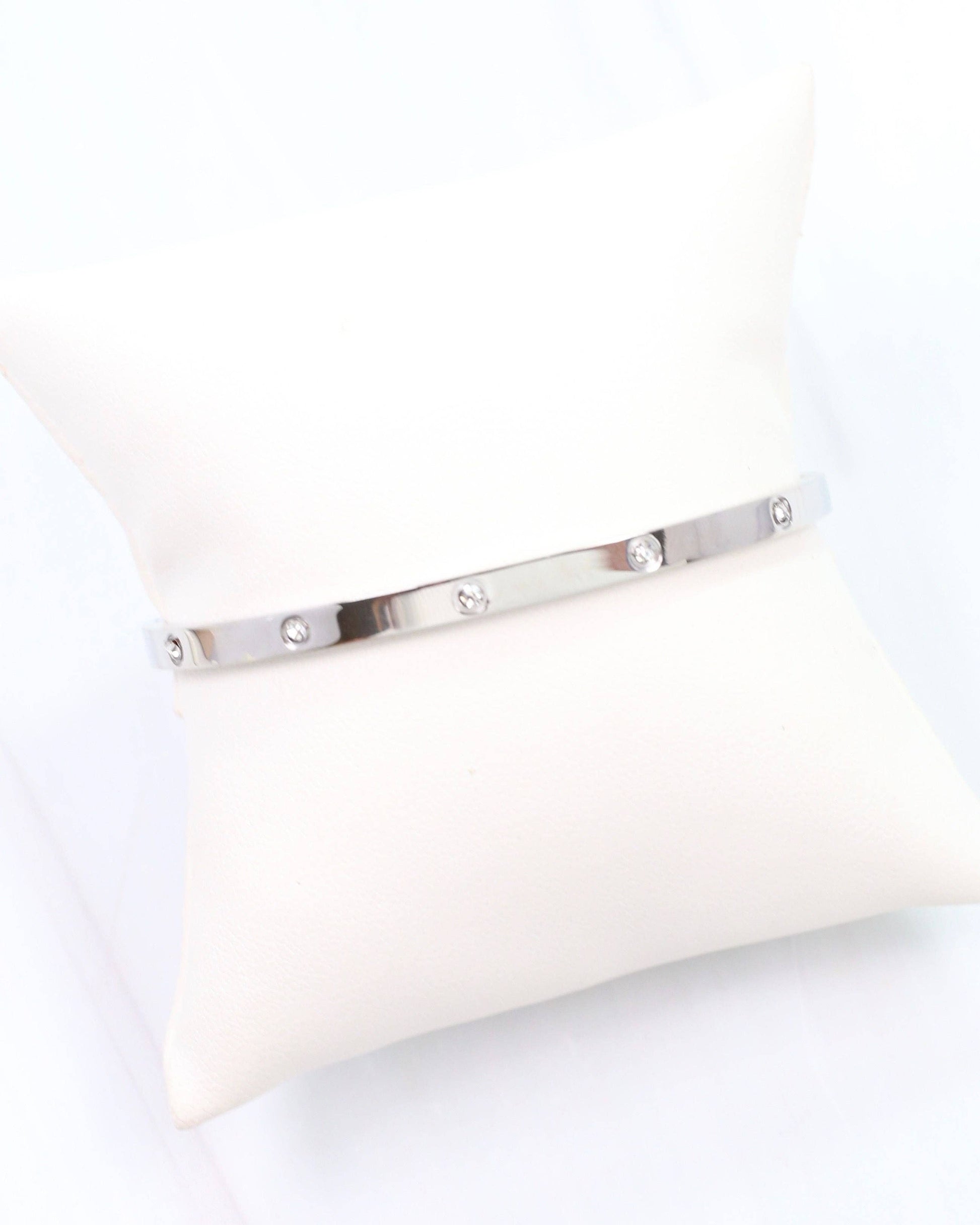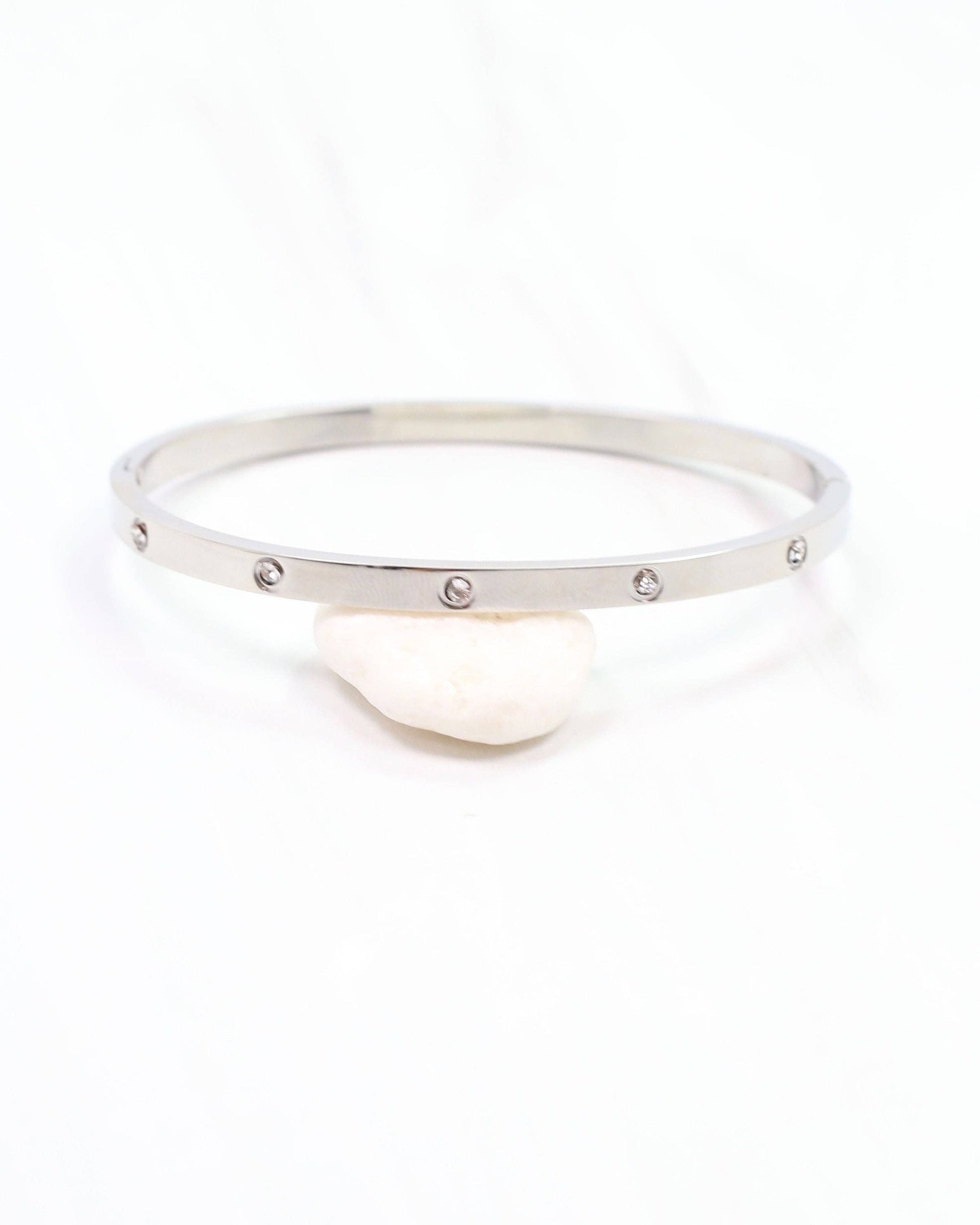 This shiny metal bracelet is accented with round CZs and a side hinge closure. Wear alone or in a stack with other bracelets. Stainless steel.