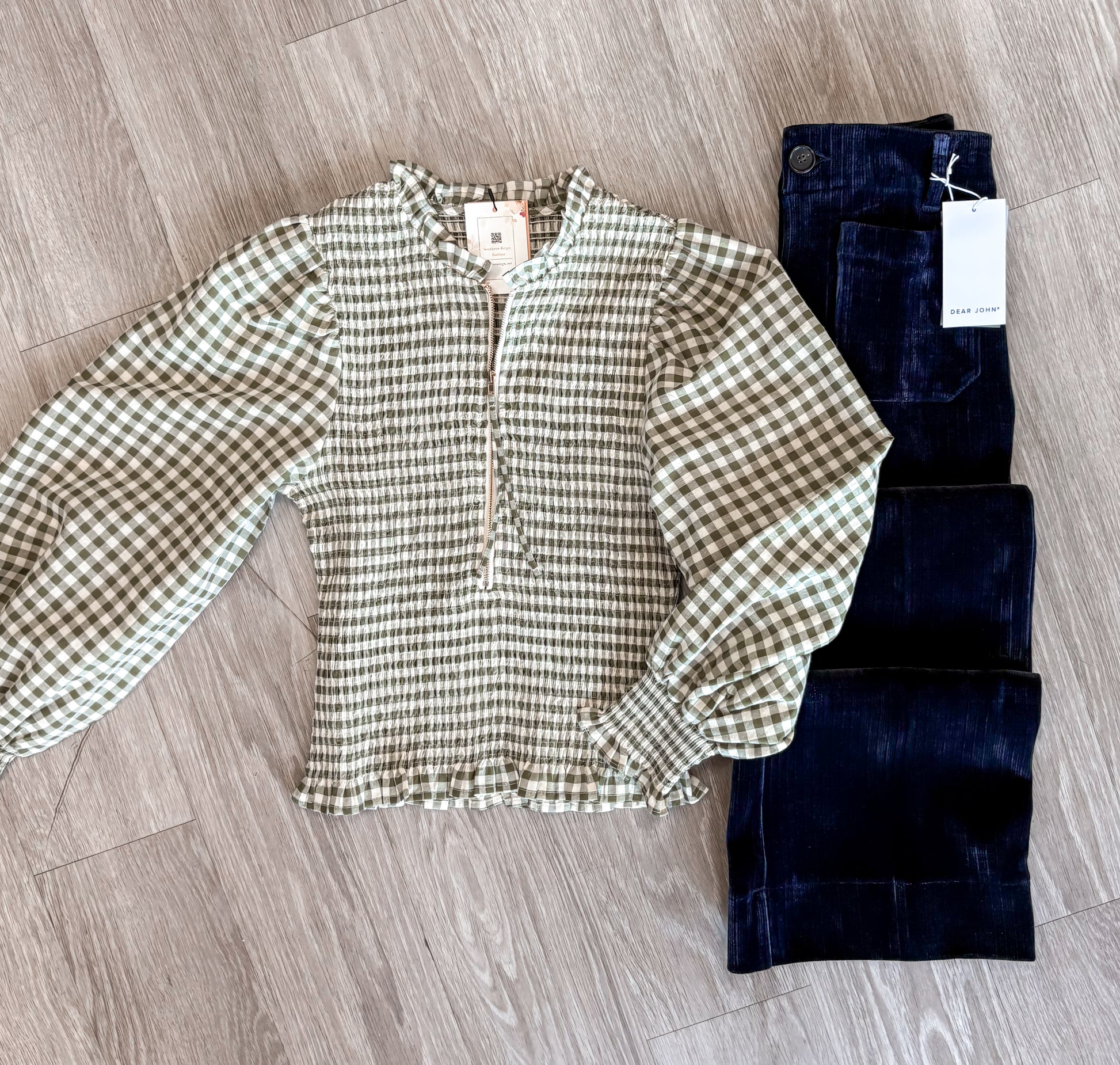 Unleash your inner fashionista with our Ginger Top! This stunning olive and white gingham top features a smocked detail for a flattering fit, along with a front zipper for a touch of edginess. Elevate any outfit with this versatile and chic long sleeve top.