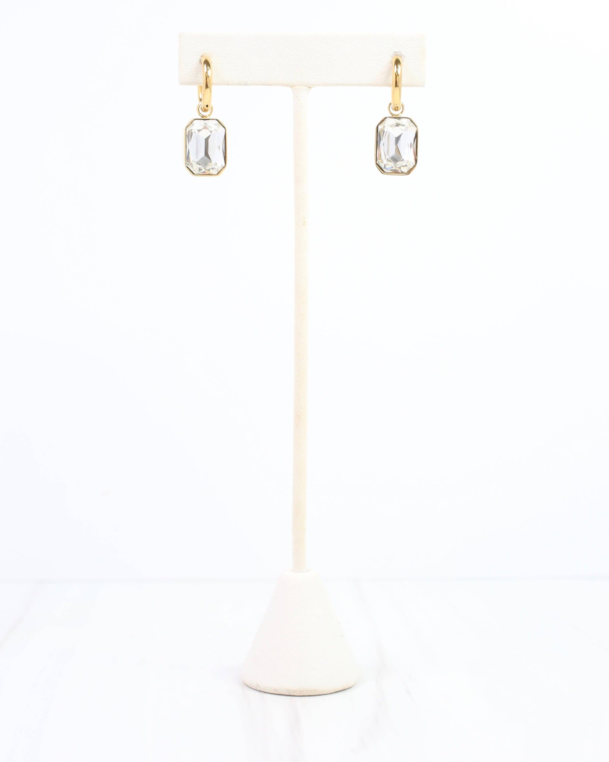 Add a touch of sparkle with the Juliette Stone Drop Earring in Gold. These shiny gold huggies feature a chic, elongated octagonal clear stone that dangles playfully, catching the light with every move. Lightweight and bold, they’re perfect for making a statement without weighing you down.