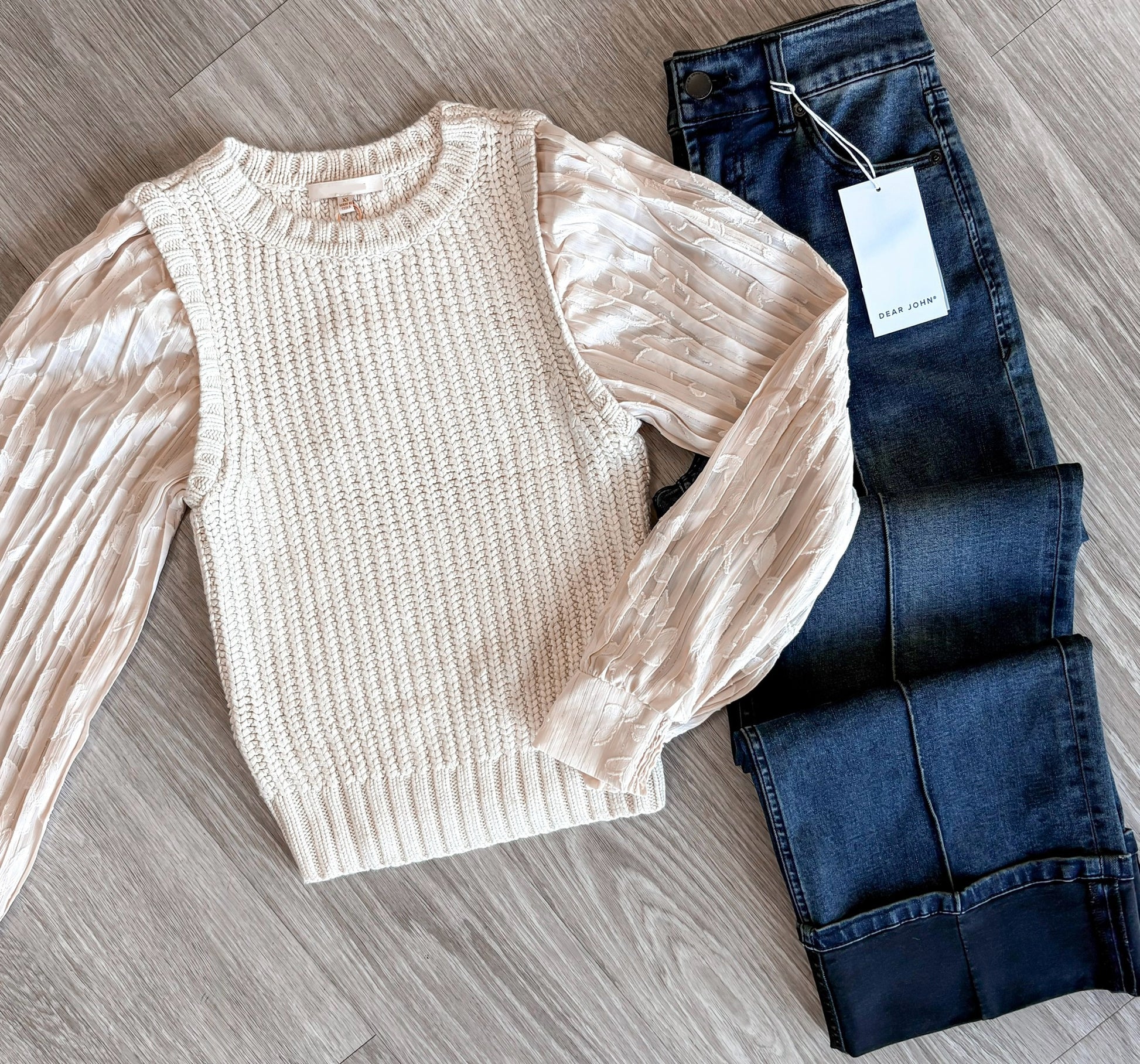 "Add a touch of elegance to your wardrobe with the Lana Top! This cream sweater features contrasting sleeves and a subtle shimmer that will elevate any outfit. Perfect for any occasion, this top is sure to make you feel sophisticated and stylish!"