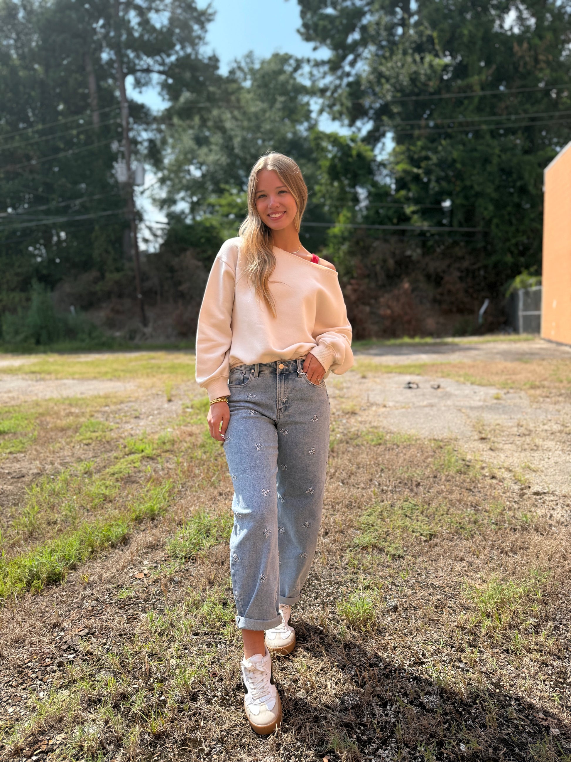 Add a touch of fun to your wardrobe with our Maisie Top! This playful off shoulder top is made from cozy French terry fleece and comes in a unique bone color. Perfect for a casual day out or a night in.