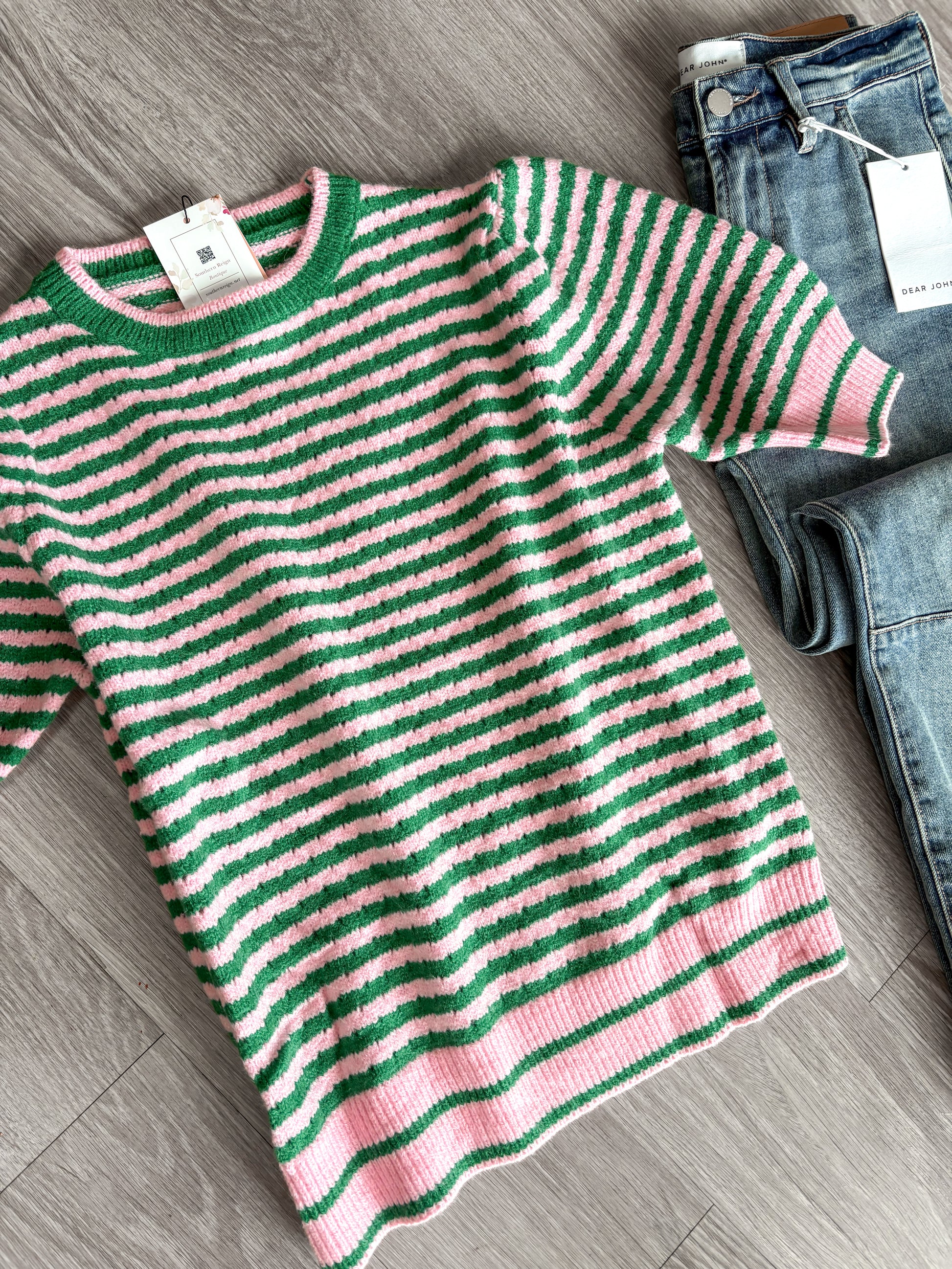 Stand out from the crowd with our Miranda Sweater Top! This short sleeve sweater boasts a unique green and pink striped design that will liven up any outfit. Stay cozy and stylish at the same time with this playful and quirky top.