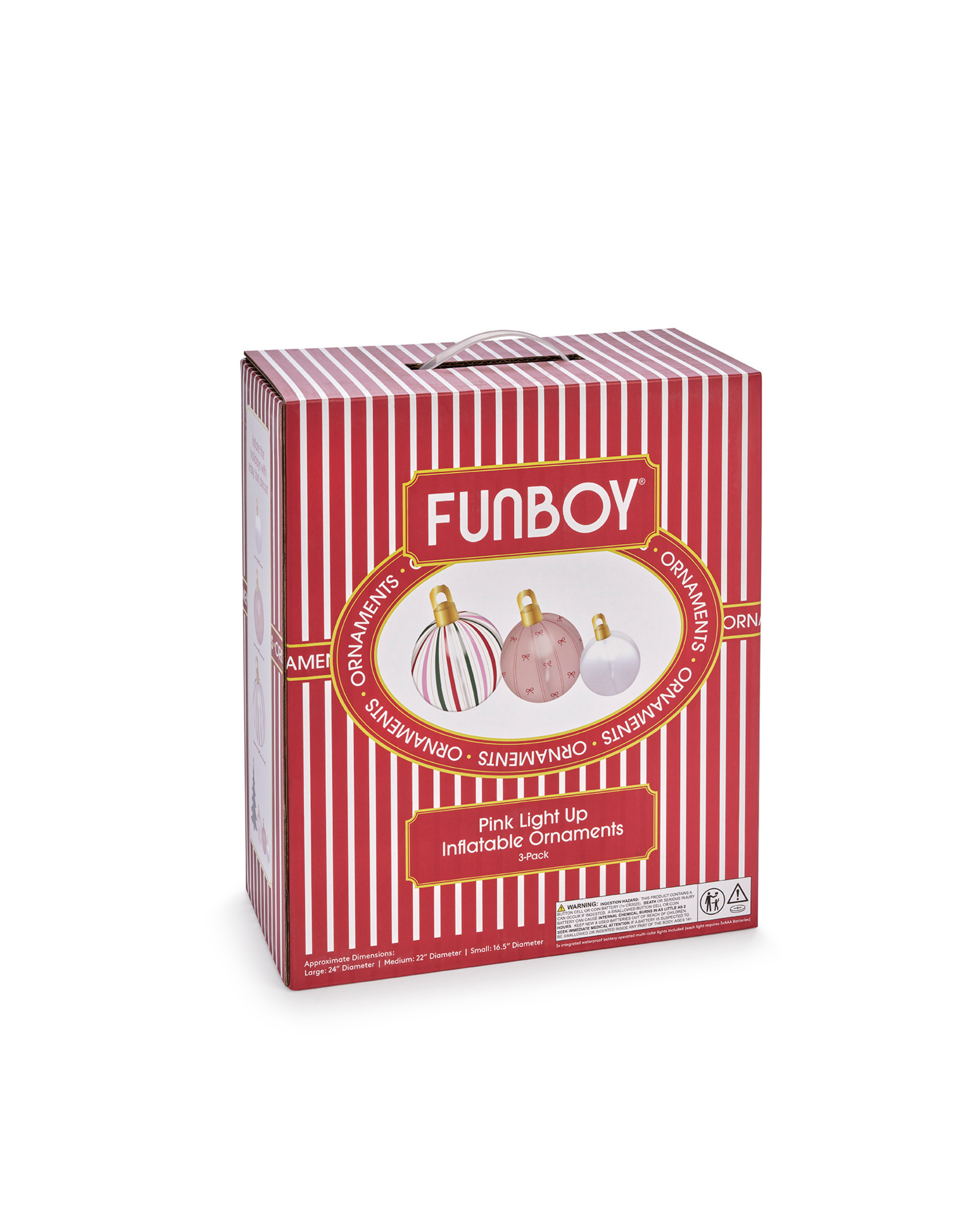 Add a pop of fresh color - introducing pink Christmas decorations. Santa will have no issues finding your house with these oversized light-up Pink Ornaments! Sold as a 3-pack with a Large (24”), Medium (22”), and Small (16.5”), these inflatables are perfect for indoor or outdoor use - they even float! Features include bright battery operated LEDs with 16 different colors and multiple light modes, including a flash and fade party mode. Remote control with timer. Built with a weighted base to stay upright, these ornaments bring a touch of Christmas magic that lasts through the season. The waterproof design allows for fun in the pool or snow! Inflatable and easy to store. Patent pending. Spread the cheer! Requires 3xAAA batteries per light (Batteries not included).