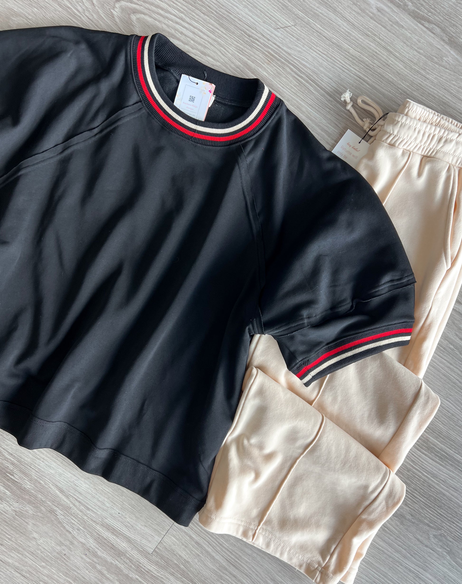 Elevate your style with our Quinn Top! This sleek black top features striking red and tan stripes, adding a pop of color to your wardrobe. With its unique arm sleeve and neck trim, you'll exude confidence and make a bold statement wherever you go. Upgrade your fashion game now!