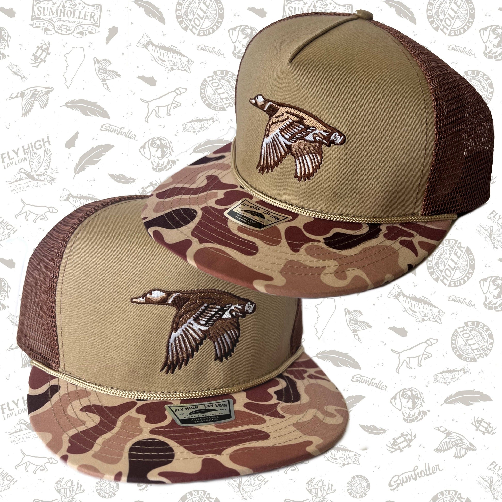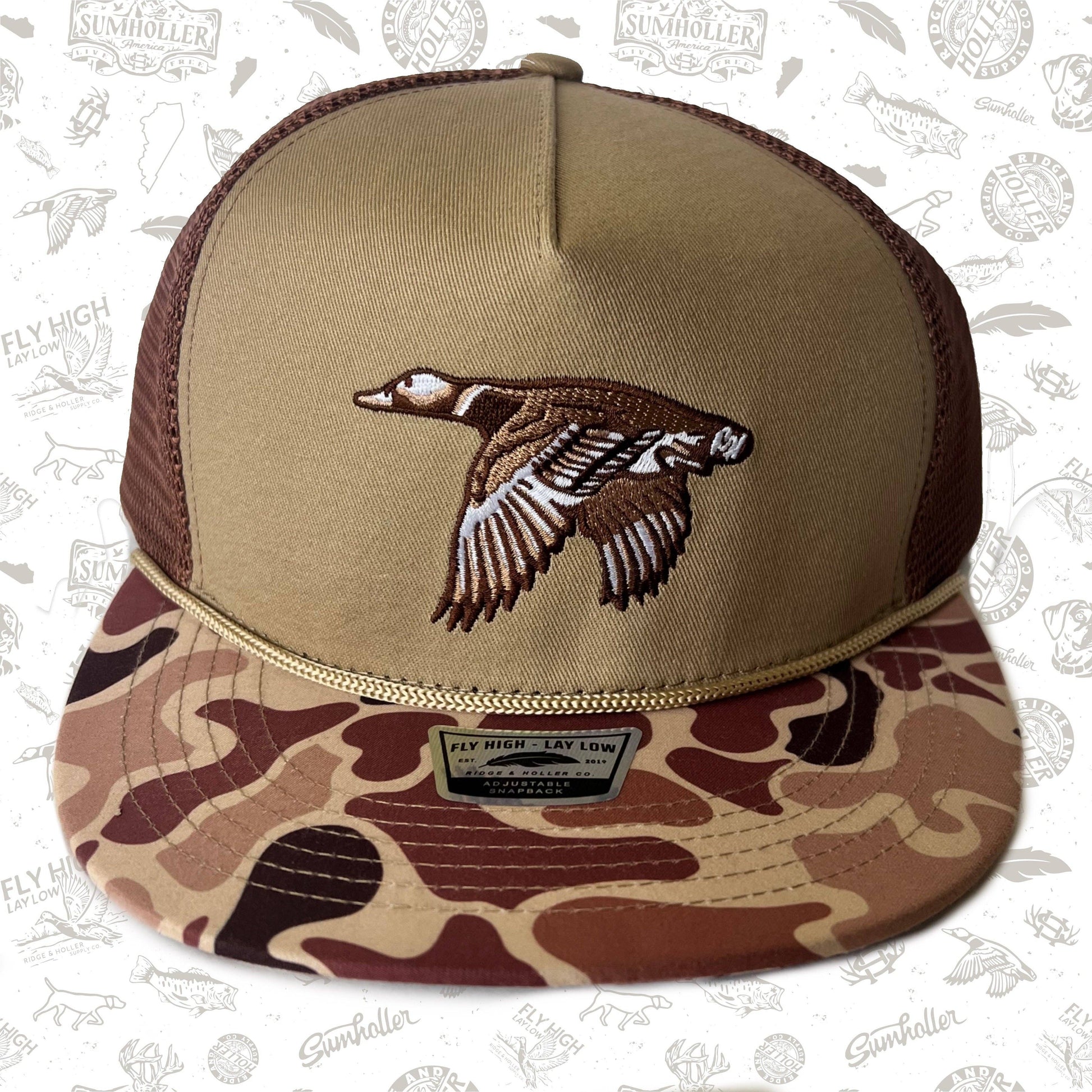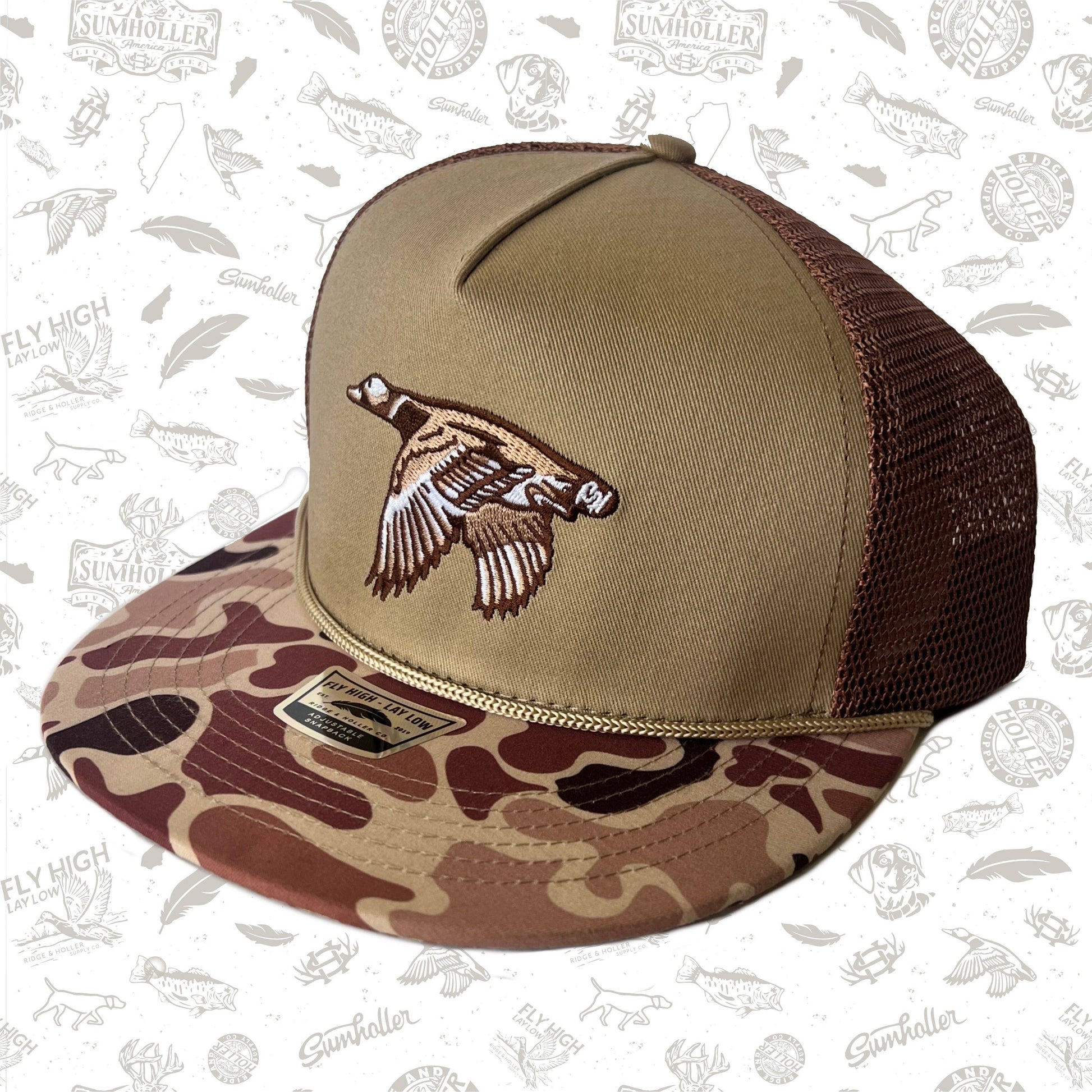 Introducing the latest addition to the Ridge&Holler collection - the Buckshot Boone hat. This is a limited edition style. It combines style and comfort with a flat bill and tall crown fit, featuring a clean khaki and woodland camo color way that adds a touch of rugged appeal. Stay comfortable on your next outdoor excursion with this versatile cap. Fly High Lay Low